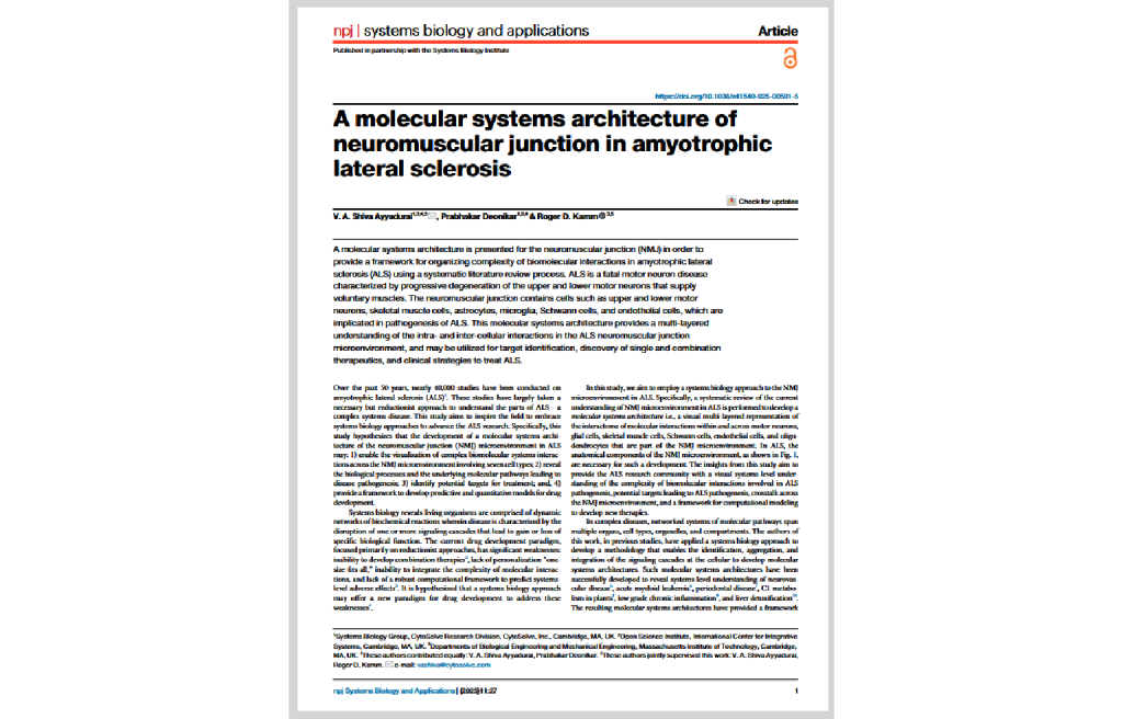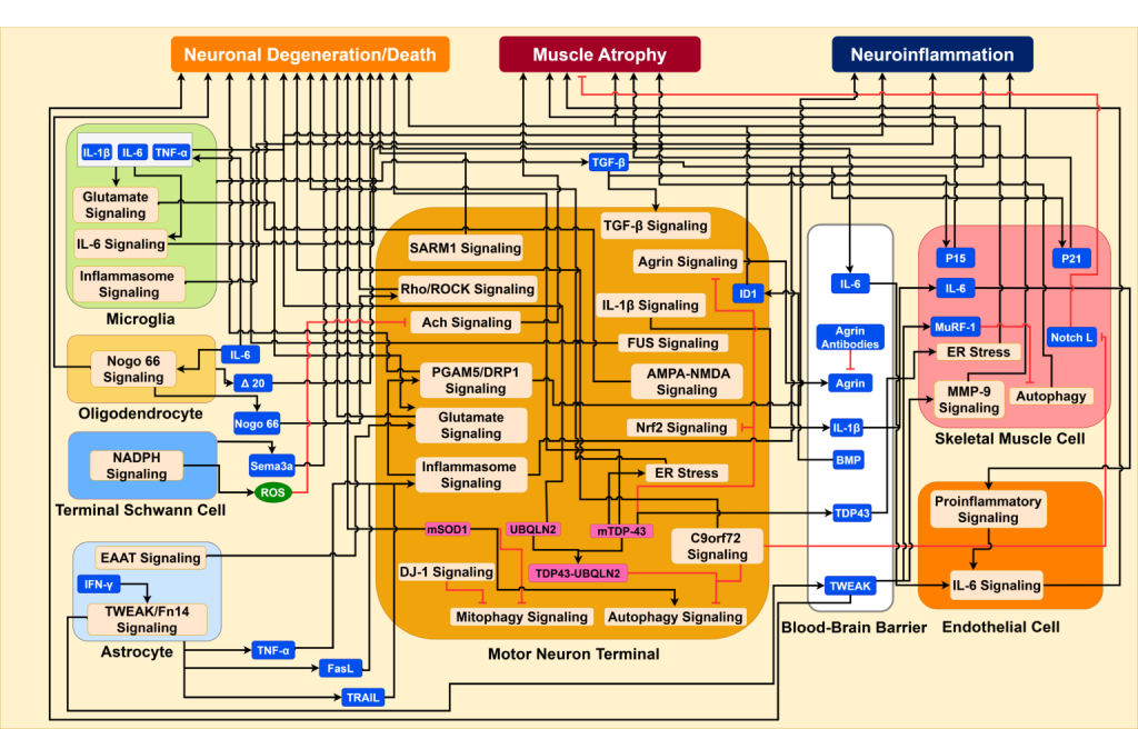 This webpage provides the web-enabled molecular systems architecture of neuromuscular junction (NMJ) in amyotrophic lateral sclerosis as referred in the Discussion section of the publication (https://www.nature.com/articles/s41540-025-00501-5). The aim of this page is to provide an open source, web-enabled understanding of the NMJ “microenvironment” so the ALS community can provide feedback, be it new information, critiques, and comments to advance this understanding. The NMJ “microenvironment” herein differs from the more conventional view. The “conventional” ALS community for decades has viewed the NMJ “microenvironment” from a purely anatomical perspective to consist only of motor neurons, skeletal muscle cells, and the terminal Schwann cells. In contrast, in this paper and in the Supplementary Information, the “microenvironment” encompasses all cell types that interact with each other on a systems level. The NMJ microenvironment as described here is based on a systems-level perspective to include not only motor neurons, skeletal muscle cells, and terminal Schwann cells that reside anatomically in the immediate vicinity of the NMJs, but also those cells that impact total motor unit function from the NMJ to the brain, and therefore needs to include astrocytes, microglia, and oligodendrocytes, since they affect total motor unit function from the NMJ to the brain. This systems-level presentation of the NMJ microenvironment provides a more evolved understanding to advance ALS pathogenesis research, also supported by others (Lee et al.,2016, and Ileva et al., 200):