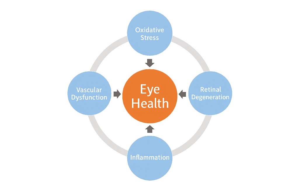 Eye health is a vital component of overall well-being, as vision plays a central role in daily functioning, independence, and quality of life. The eye is a highly specialized organ, susceptible to damage from internal and external factors that can lead to conditions such as age-related macular degeneration (AMD), diabetic retinopathy, glaucoma, and cataracts. Four primary contributors to declining eye health include oxidative stress, retinal degeneration, inflammation, and vascular dysfunction.Oxidative stress results from an imbalance between free radicals and antioxidants in the eye, which can damage the retina and lens proteins, contributing to diseases like AMD and cataracts. Retinal degeneration involves the deterioration of photoreceptor cells, often associated with aging or genetic disorders, leading to vision loss. Inflammation plays a dual role—while it is part of the body’s immune response, chronic ocular inflammation can damage retinal tissues and accelerate disease progression. Vascular dysfunction, particularly affecting the delicate capillaries of the retina, is a key factor in diabetic retinopathy and other ischemic eye diseases. Maintaining eye health requires a multifaceted approach, including a nutrient-rich diet (high in lutein, zeaxanthin, vitamin A, C, E, and omega-3 fatty acids), regular eye exams, blood sugar control for diabetics, protection from UV radiation, and avoiding smoking. Advances in systems biology and in silico modeling offer promising avenues for identifying molecular targets and developing personalized therapies to prevent or reverse ocular diseases. As life expectancy increases, proactive management of eye health becomes essential to preserving vision and enhancing quality of life.
