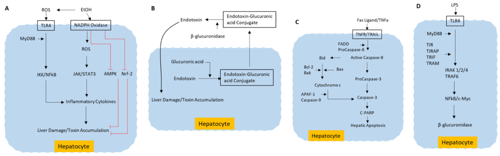 Molecular pathways of liver toxicity. (A) ROS production resulting from exogenous toxins, such as alcohol, inducing liver damage by apoptosis; (B) Liver damage caused by deconjugation of endotoxins; (C) Death receptor-mediated signaling pathway in liver cells inducing liver damage by apoptosis; (D) β-glucuronidase synthesis pathway induced by endotoxin LPS. EtOH—Ethanol; ROS—Reactive oxygen species; TLR4—Toll like receptor 4; NADPH—Nicotinamide adenine dinucleotide phosphate; MyD88—Myeloid differentiation primary response 88; IKK—IκB kinase; NFkB—Nuclear factor kappa-light-chain-enhancer of activated B cells; JAK—Janus kinase; STAT3—Signal transducer and activator of transcription 3; AMPK–5’—AMP-activated protein kinase; Nrf-2—Nuclear factor erythroid 2–related factor 2; TNFa—Tumor necrosis factor-alpha; TNFR—TNF receptor; TRAIIL—TNF-related apoptosis-inducing ligand; FADD—Fas-associated death domain; Bid—BH3 interacting domain; Bcl2—B-cell CLL/lymphoma 2; Bax—Bcl2-associated X protein; Bak—Bcl-2 homologous antagonist/killer; APAF-1—apoptosis-activating factor-1; C-PARP—cleaved Poly (ADP-ribose) polymerase; LPS—Lipoplysaccharide; MyD88—Myeloid differentiation primary response 88; TLR4—Toll-like receptor 4; TIRAP—TIR domain containing adaptor protein; TRIF—TIR domain-containing adaptor inducing IFN-β; TRAM—TRIF related adaptor molecule; IRAK 1/2/4—IL-1R-associated kinases 1/2/4; TRAF6—TNF-receptor-associated factor 6; NF-κB—nuclear factor kappa-light-chain-enhancer of activated B cells; c-Myc—Cellular myelocytomatosis.
