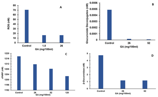 Effect of GA on liver toxicity pathways. (A) Effect of GA on ROS levels. GA supplementation led to reduction in reactive oxygen species concentrations compared to control. (B) Effect of GA on glucuronide deconjugates levels. GA supplementation led to reduction in glucuronide deconjugate concentrations compared to control. (C) Effect of GA on cPARP levels. GA supplementation led to a reduction in cPARP concentrations compared to control. (D) Effect of GA on β-glucuronidase levels. GA supplementation led to reduction in β-glucuronidase concentrations compared to control. GA—Glucaric acid; ROS—Reactive oxygen species; cPARP—cleaved poly (ADP-ribose) polymerase.