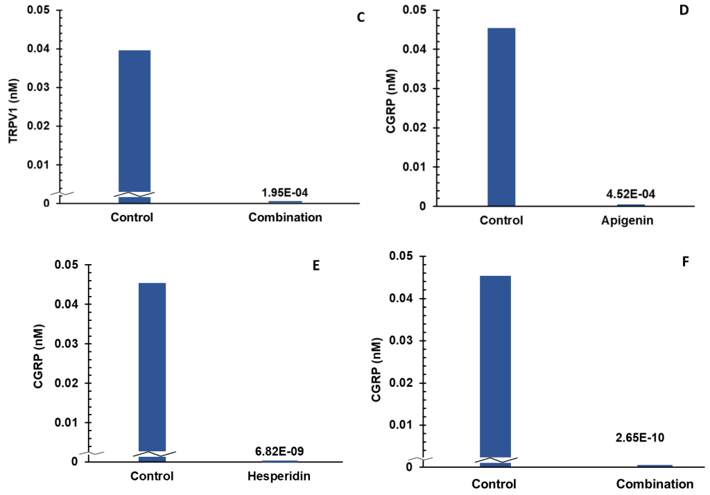 Individual (A,B) and combination effect (C) of apigenin and hesperidin on TRPV1 production in chondrocytes over simulations periods of 2 days. Apigenin at 30 mg dose (A), hesperidin at 1000 mg dose, (B) and their combination at 1030 mg dose (C) reduced the levels of TRPV1 over a period of 2 days. Individual (panels D and E) and combination effect (panel F) of apigenin and hesperidin on CGRP production in chondrocytes over simulation periods of 2 days. Apigenin at 30 mg dose (D), hesperidin at 1000 mg dose, (E) and their combination at 1030 mg dose (F) reduced the levels of CGRP over a period of 2 days. TRPV1—transient receptor potential cation channel subfamily V member 1. CGRP—calcitonin gene-related peptide.